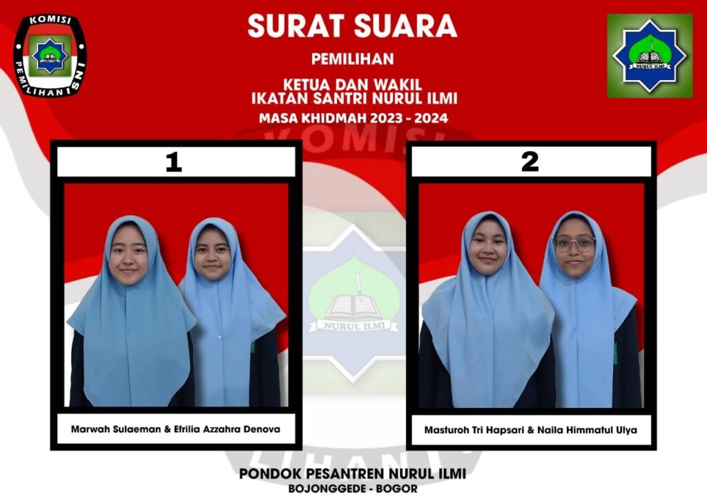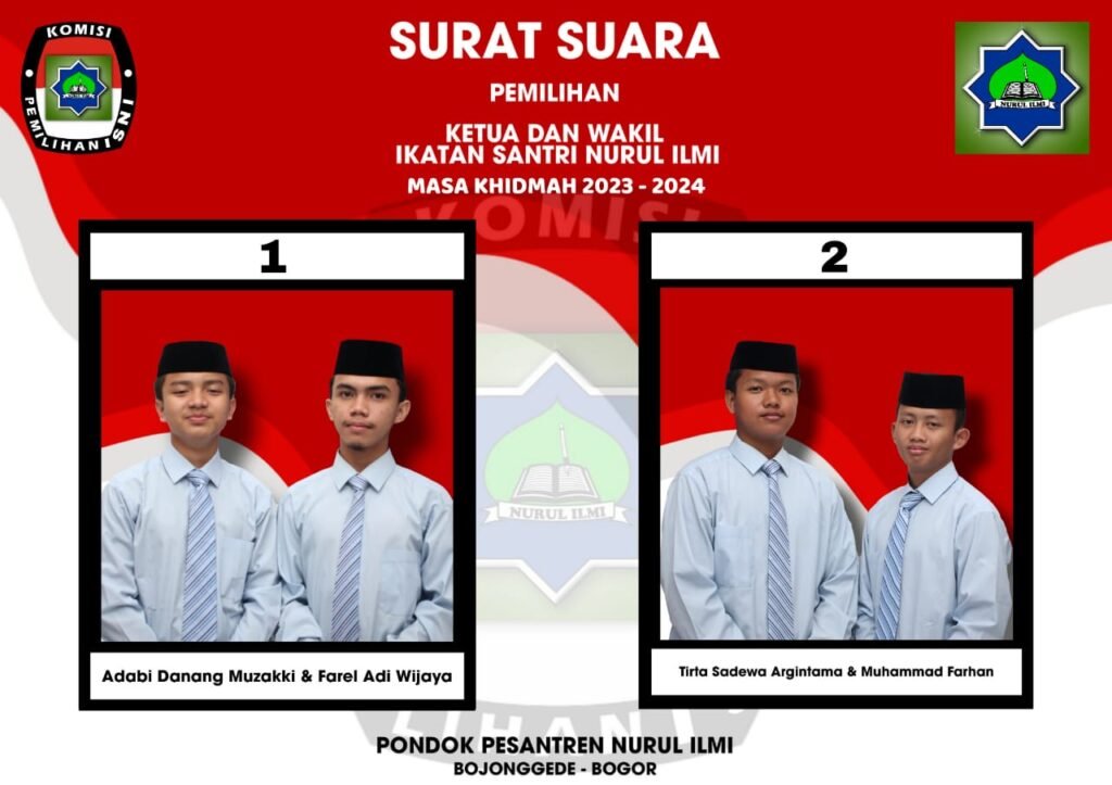 Bojonggede – Pondok Pesantren Nurul Ilmi Bojonggede Bogor telah menyelenggarakan acara “Pemilihan Ketua & Wakil Ketua Organisasi ISNI (Ikatan Santri Nurul Ilmi) Masa Khidmat 2023-2024 M pada hari rabu, 26 juli 2023, yang bertempatkan di Lapangan Olahraga (untuk santri putra) dan di Aula (untuk santri putri), para santri dan asatidz pun sangat semangat dan antusias dalam mengikuti acara ini.