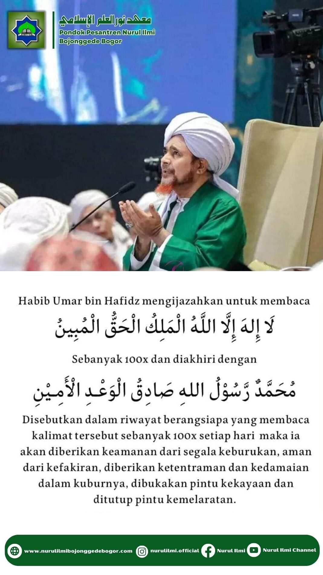“Siapa yang membaca zikir itu 100 kali itu akan terbuka pintu-pintu surga. Dan akan dibukakan baginya pintu kekayaan,” kata Habib Umar bin Hafidz.